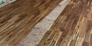 無垢のフローリングの施工状況。部屋の両サイドから張り進めてい …