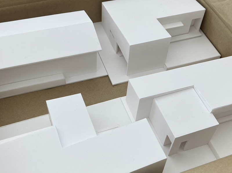 初回プレゼン用にボリューム模型を4つ。模型作りはどちらかと言うと好き。とは言え。眼精疲労が。